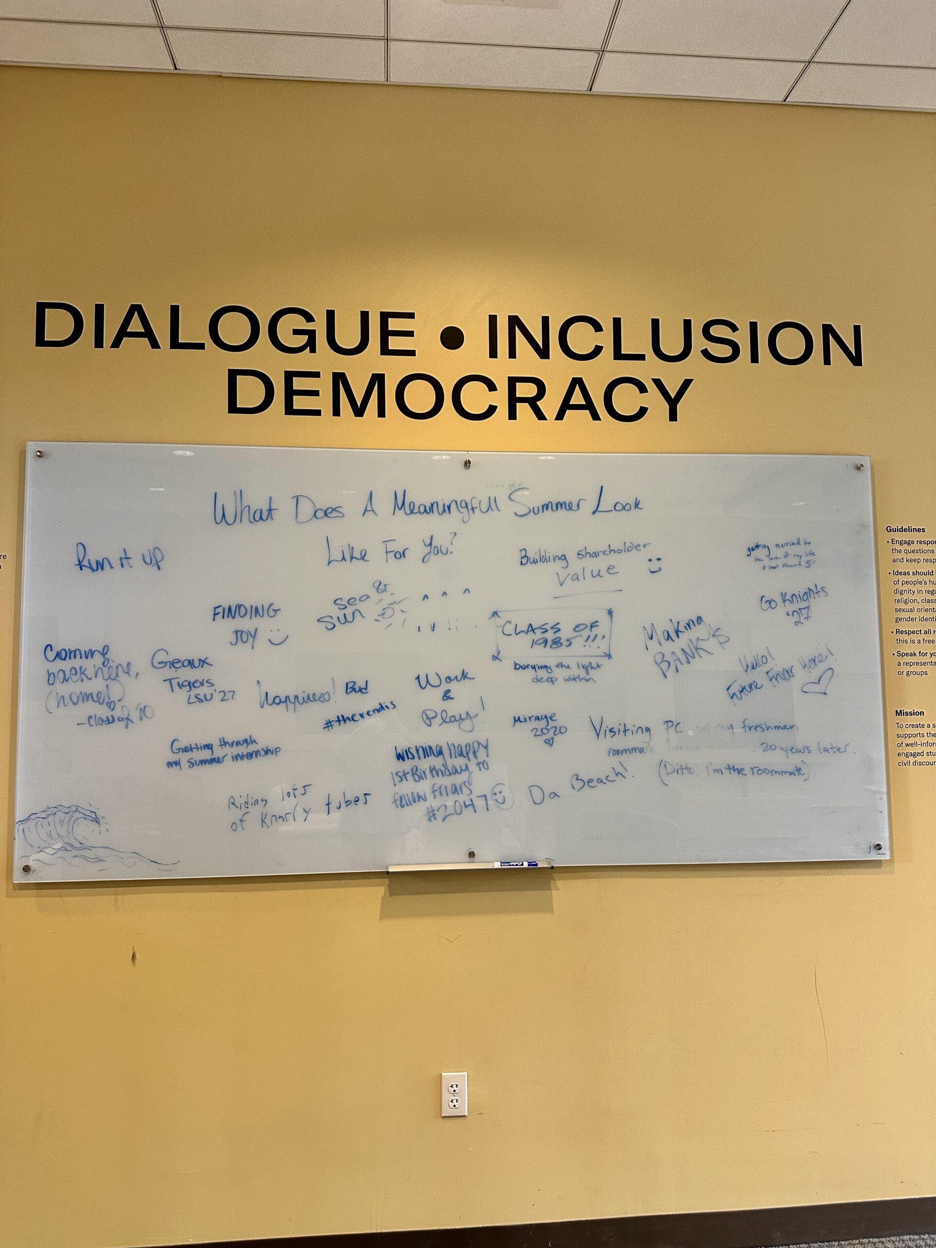 We have seen the power of student leadership in civil discourse efforts on campus, evidenced by the creation of student-led “democracy walls” beginning in 2018. After learning to integrate deliberative practices in a course on dialogue, diversity, and civic engagement taught by Dr. Bevely and Dr. Longo, a team of students created democratic spaces for civil discourse on campus–initially in the Feinstein Academic Center and soon thereafter in the Center at Moore Hall and now Athletics, the Ryan Center for Business Studies, and the Science Complex. These public spaces aim to “create a safe space that supports the development of well-informed and engaged citizens through civil discourse.” The DID Lab has created an easy-to-use toolkit to help you get started on your campus/in your community.